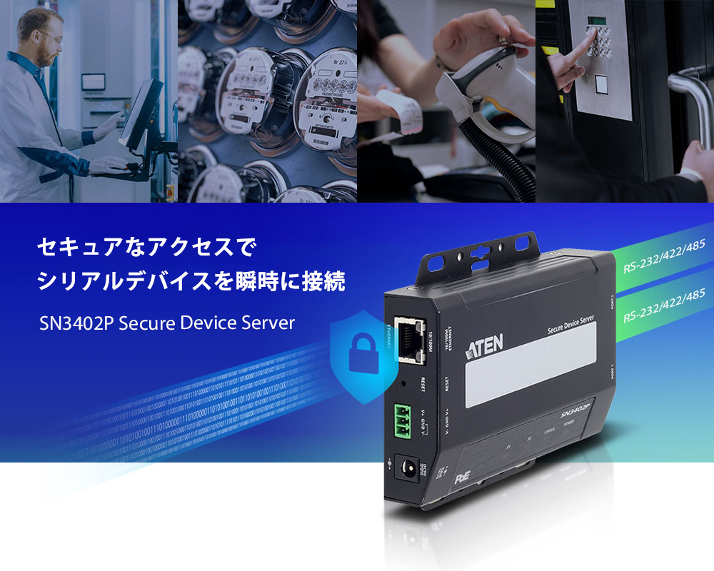 使いやすく、安全で信頼性の高いソリューションにより、様々なシリアルデバイスをIPベースのイーサネットLANに瞬時に接続することが可能になります。ATEN SN3402P Secure Device Serverは、シンプルで高速なシリアル-イーサネット接続を提供し、PCからRS-232/422/485シリアルデバイスにリモートアクセスすることを可能にします。信頼性の高い様々な機能を搭載したSN3402Pは、商業用および産業用プロセス制御アプリケーションに最適です。