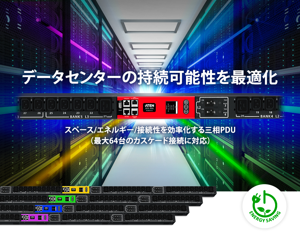 データセンターやサーバールームのような稼働が途絶えることのない環境では、エネルギー効率は大変重要な要素となります。効果的な電源管理には、ハードウェアとソフトウェアの両面で取り組む必要があります。発電・送電・配電の効率化により三相電力のトレンドが高まる中、サーバールームやデータセンターなどの高密度なIT機器に対して増え続ける電力需要に対応すべく、ATENは0Uサイズでラックに取り付けられるIECアウトレット構成のPDU PGシリーズを新しくリリースしました。PG95330は、ARM-Cortex A8プロセッサーを使用し、高電圧で動作可能な30ポートのアウトレットを備えています。これらのPDUは、接続されたすべての機器の消費電力の数値データを、僅か数秒で提供します。正確に集計された計測値は、電力消費傾向、基準値、トラッキング等様々なデータ分析が可能となります。効率的な電力運用を実現する為に開発されたPG95330は、ネットワーク・インフラにおける低エネルギー消費を可能にする一方で、CO2排出量を最大70.65kg(電力消費量の131.4kWh相当)まで削減し、CO2排出量を大幅に抑え、低炭素化に貢献します。