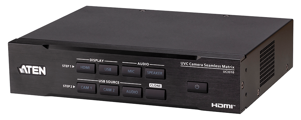 ATEN UC3310は、2つの4K@30 USBカメラ入力を1つのHDMI出力に変換し、Microsoft TeamsやZoomなどの一般的な会議プラットフォームに最適です。
