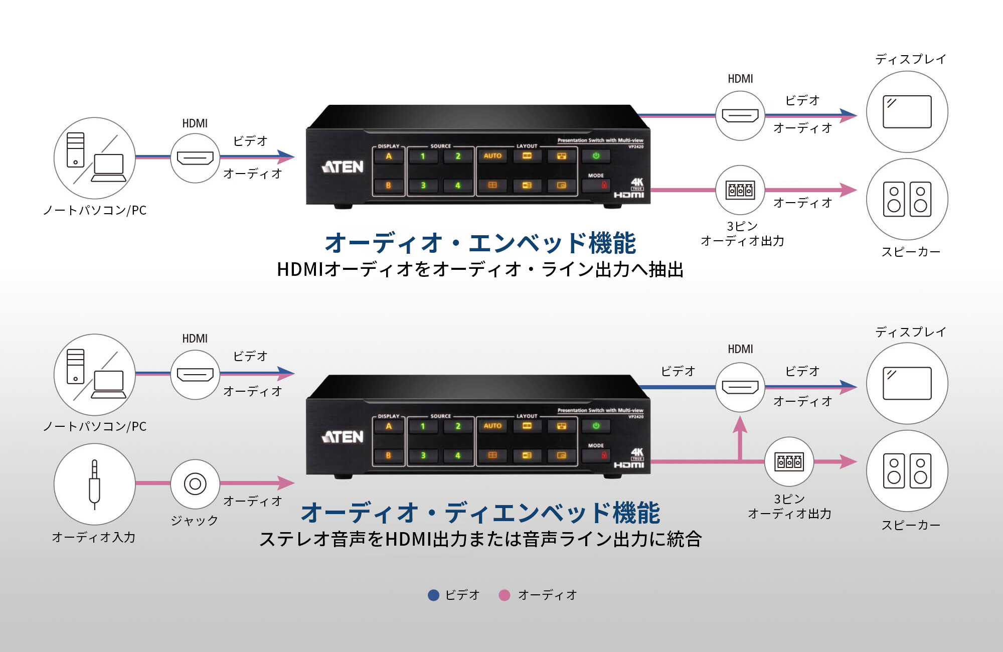 The ATEN VP2420は、映像に別の音声を追加(エンベッド)したり、映像から音声を取り出して(ディエンベッド)アンプやスピーカーで