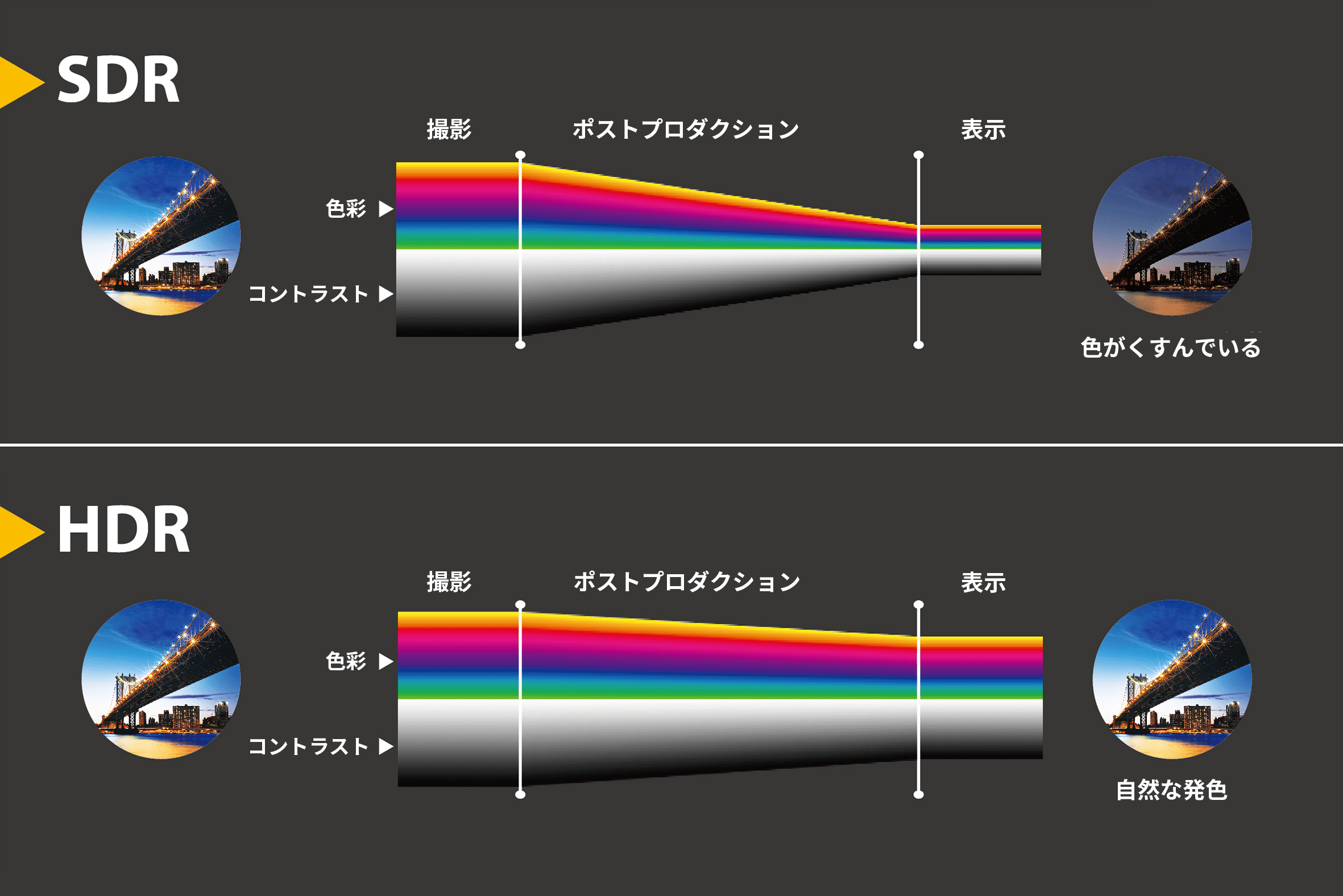 SDRとの主な比較 | ダイナミックレンジ全体を拡大 | ダイナミックレンジを拡大し、より明るいハイライトを強調します | ダイナミックレンジ全体を拡大 | ||
