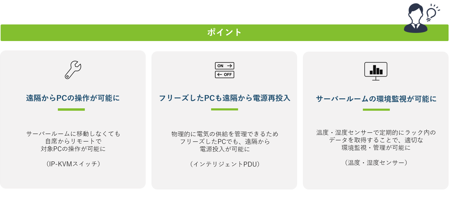 株式会社デンソーは、電力・通信・鉄道・放送などの社会インフラ企業向けに情報通信のエンジニアリング事業を提供している。また、事業の一つとして、データセンター向けDCIMソフトウェアの開発を手掛けている。その開発事業部において、開発者が日々使用しているサーバーの維持・管理・運用効率化を目的にATEN製「インテリジェントPDU」と 「IP-KVMスイッチ」を導入いただいた。
