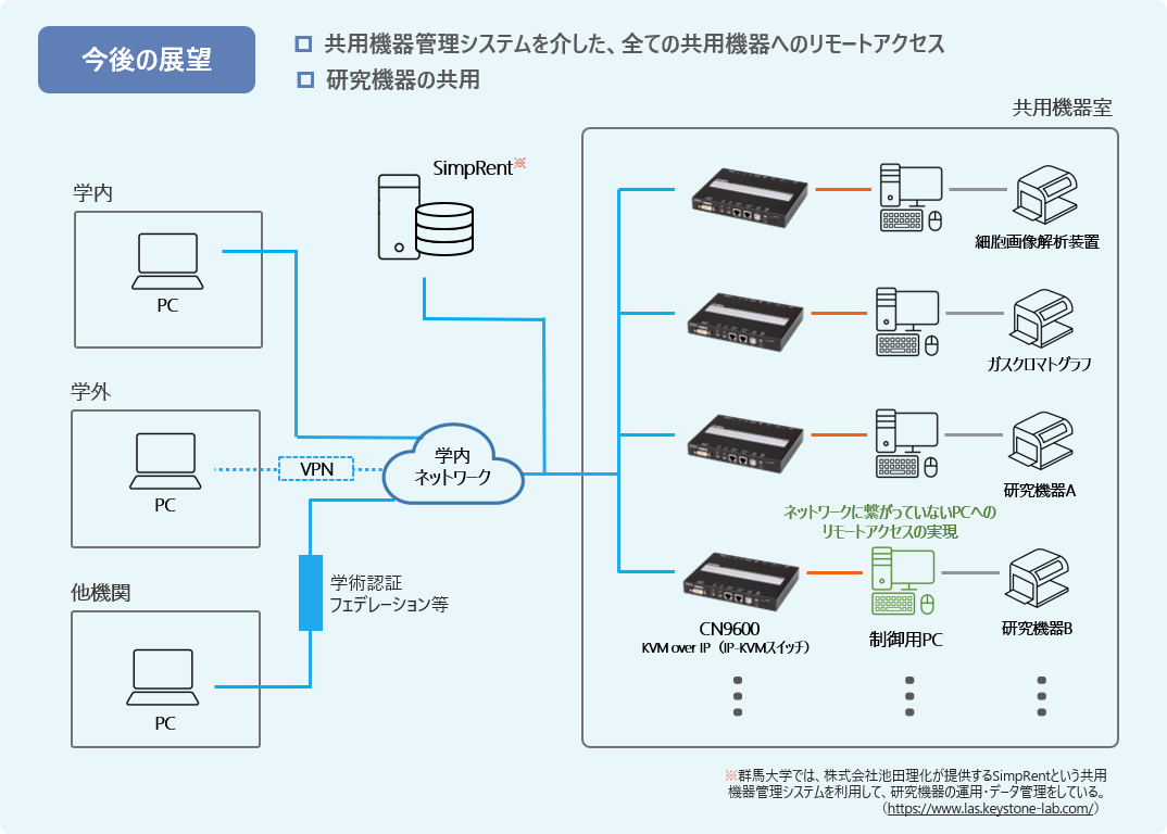 現在は4台の機器にIP-KVMを導入していますが、ゆくゆくは、可能な全ての共用機器において、遠隔化対応できるように整備していきたいと考えています。また、現在、遠隔利用できる範囲は学内のユーザーに限った運用ですが、最終的には、この遠隔システムを全国どこからでも利用できるようにし、群馬大学にしかない機器や、群馬大学にしかできない測定を皆さんに提供できるようにしていきたいと思っています。