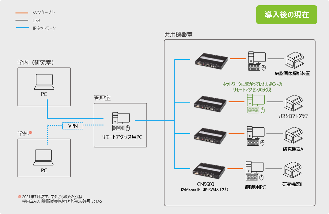 さらに、2020年4月には新型コロナウィルス感染症の拡大により、学内への立ち入り制限が実施されたことで、従来どおりに研究を継続することが難しくなっていた。これらの背景から、現地に行かなくてもリモートで機器を操作して研究活動を継続できる方法を探していたところ、「IP-KVMスイッチ」の存在を知ることになった。