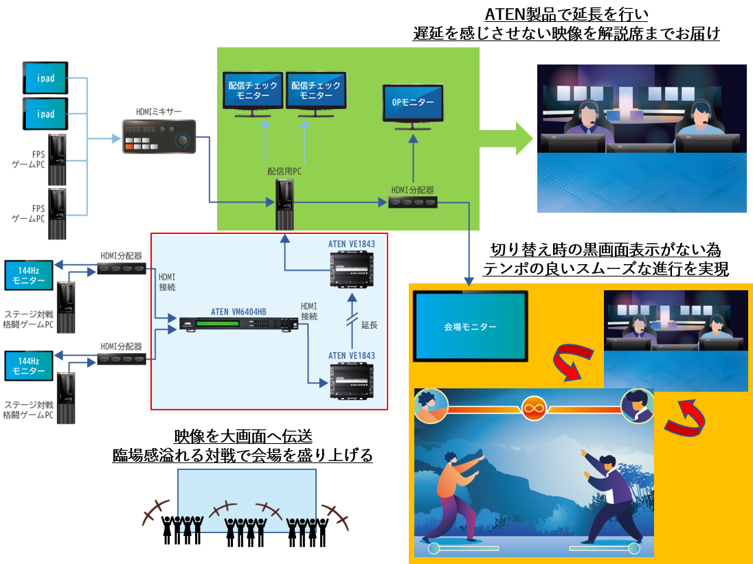 ステージ場に配置された、選手達が使用するゲーミングPCの映像をVM6404HBで集約・切り替えを行う環境を構築、切り替えた映像を高画質の状態を維持しつつ離れた場所に設営されている配信用PCへ映像の伝送を行い、接続されているチェック用モニターやHDMIスプリッターへ経由しOPモニターや会場メインステージの大型モニターへ映像を出力
