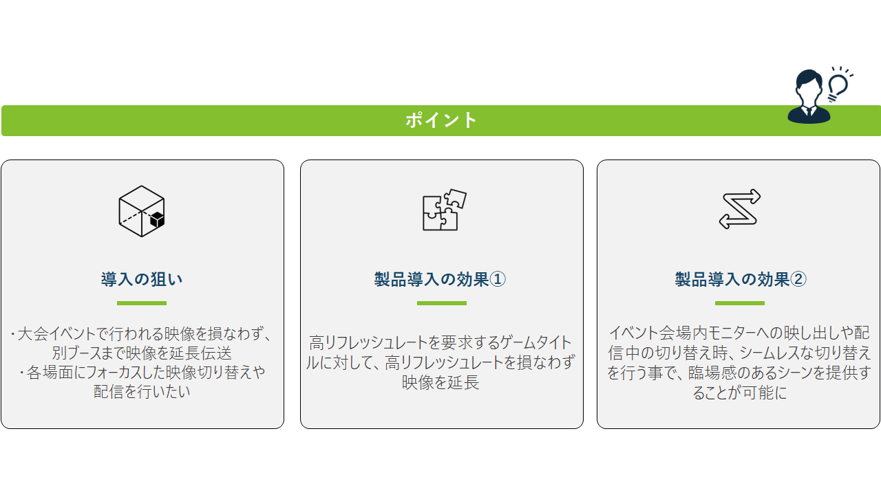 - ・一番のポイントになった部分は、ゲームタイトルによっては高リフレッシュレート環境が必要になるが、その環境に対応と分配が可能といった部分が決め手になった