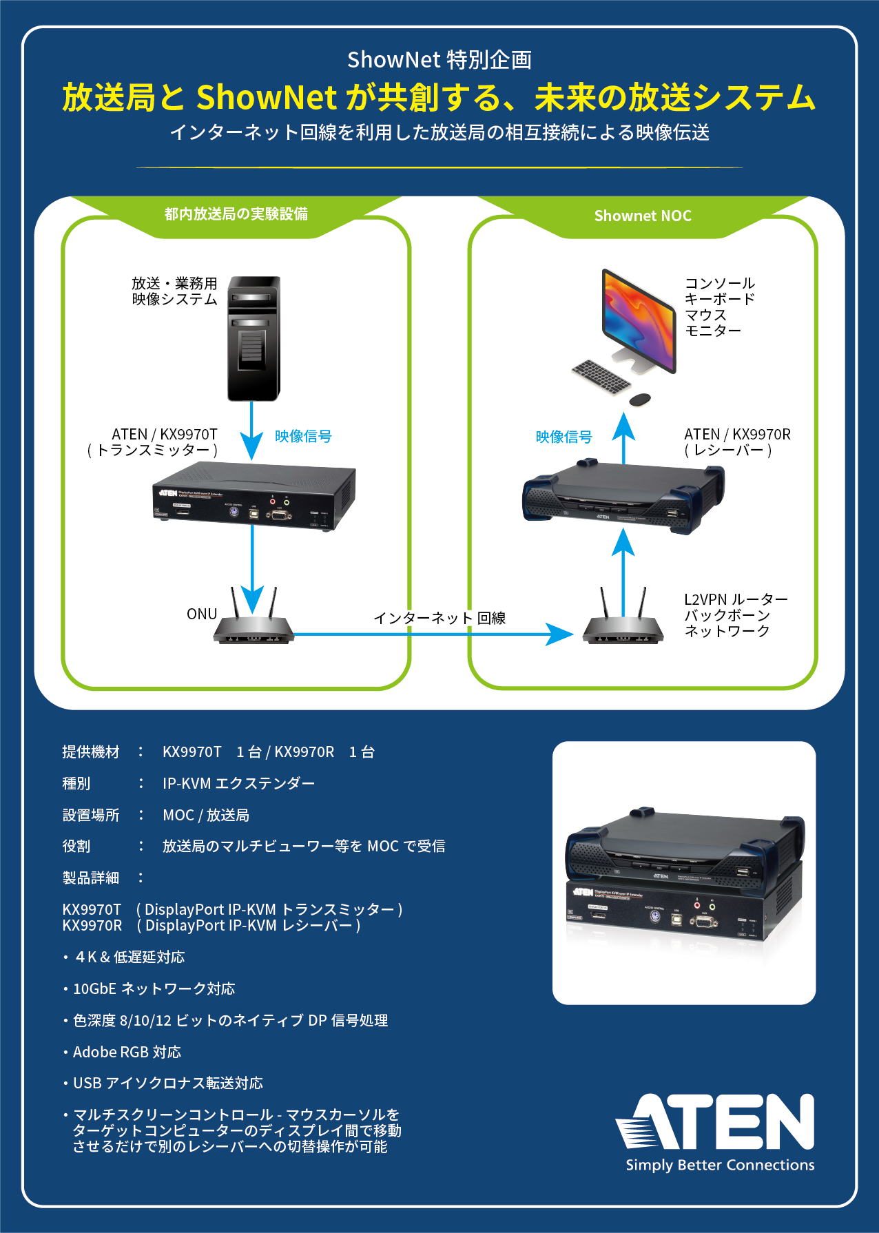 そこで、KVMを使った映像伝送と、機材のリモートコントロールが必要になることから、IP KVMエクステンダー「KX9970T/R」を使っています。ネットワークのスペシャリストやコントリビュータが集まり、最新の技術を使ってネットワークインフラを作っていくというのが、今回の取り組みです。
