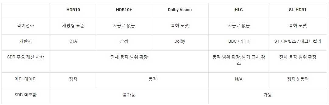 현재 다양한 산업 지원과 개별적으로 가능한 콘텐츠를 제공하는 3가지 주요 HDR 포맷과 차후 나올 추가 포맷 2가지가 있습니다.