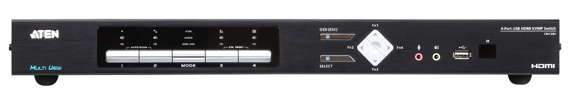 CM1284는 ATEN의 멀티 뷰 KVM 라인업 제품군으로 콘솔에서 듀얼 4K 보기와 바운드리스 스위칭을 통해 멀티 뷰 운영을 손쉽게 제어할 수 있다. 최대 4K (4096 x 2160 @ 30Hz) 비디오 해상도 듀얼 출력 기반 실시간 모니터링은 쿼드 뷰, PiP, PbP, PoP 디스플레이 모드를 제공하며, 필요에 의해 전체 화면 모드도 선택할 수 있다.