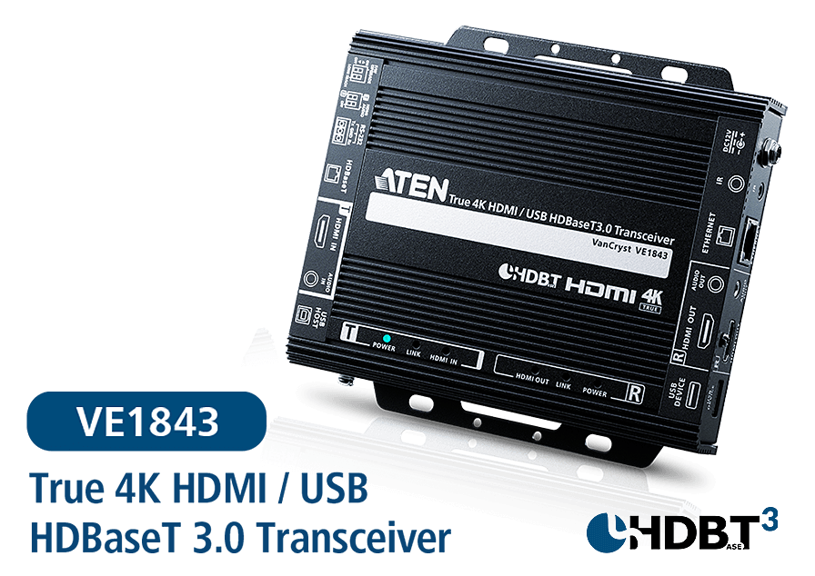ATEN의 HDBaseT 솔루션은 비압축 UHD AV 전송을 지원합니다. AV 분배 품질을 한 단계 높이기 위해 ATEN은 대기 시간이 0인 압축되지 않은 True 4K @ 60Hz 4:4:4 AV 배포 기술의 최신 HDBaseT Spec 3.0을 통합한 트랜시버 VE1843을 출시하여 높은 시각적 성능으로 고품질의 멀티미디어 컨텐츠를 제공합니다.