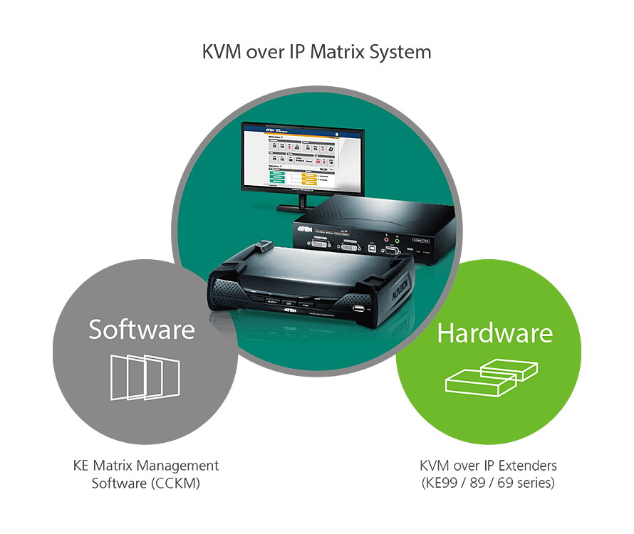 ATEN의 모든 KE 제품군은 DisplayPort, HDMI 및 DVI까지, 모든 제어실 환경의 모든 수요를 지원합니다.