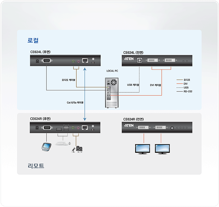 CE624는 최신 HDBaseT™ 2.0 기술을 통해 안정적인 비디오, 오디오, USB, RS-232 신호 전송을 제공합니다. CE624는 단일 Cat6/6a 케이블로 소스 컴퓨터에서 최대 100미터까지 고품질 DVI 듀얼뷰 비디오, PCM 2채널 디지털 오디오, USB 2.0, RS-232 신호를 제공합니다. 간단한 케이블 설치로 다양한 신호를 지원하여 교통 제어 센터, 의료 센터, 산업용 창고, 확장 워크 스테이션과 같이 편리한 원격 접속이 필요한 환경에 이상적입니다.