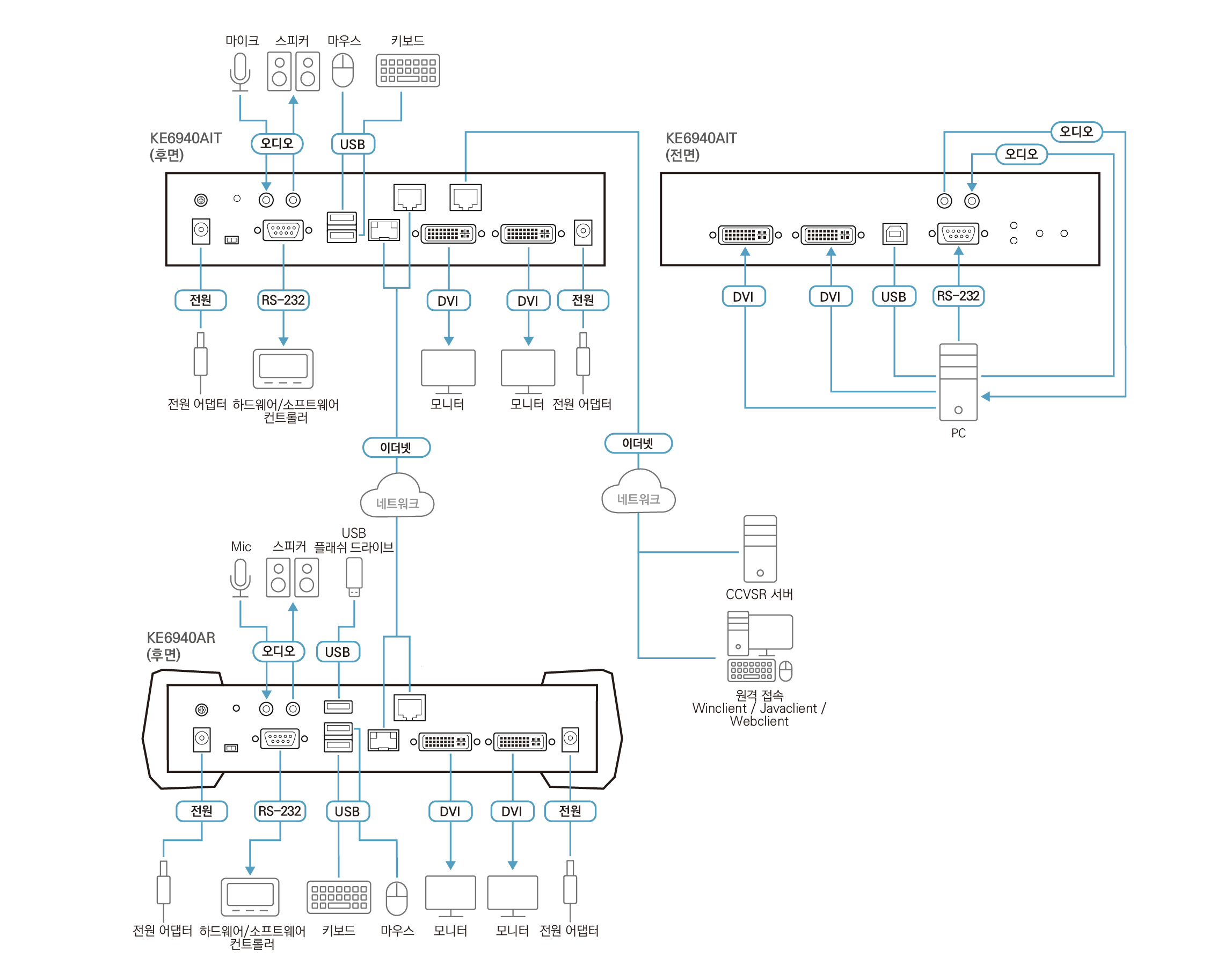 IP 기반 매트릭스 연장기인 KE6900AiT는 일대일 방식(포인트 투 포인트 point-to-point) / 일대다 방식(포인트 투 멀티포인트 point-to-multipoint) / 다대일 방식(멀티 포인트-투-포인트 multipoint-to-point) 확장기로 사용하거나 KVM over IP 매트릭스 시스템 (멀티 포인트-투-멀티 포인트)에 통합 할 수 있습니다. KE 매트릭스 관리 소프트웨어 (CCKM)와 결합하여 다양한 작업 환경에서 보다 유연한 애플리케이션을 제공합니다.