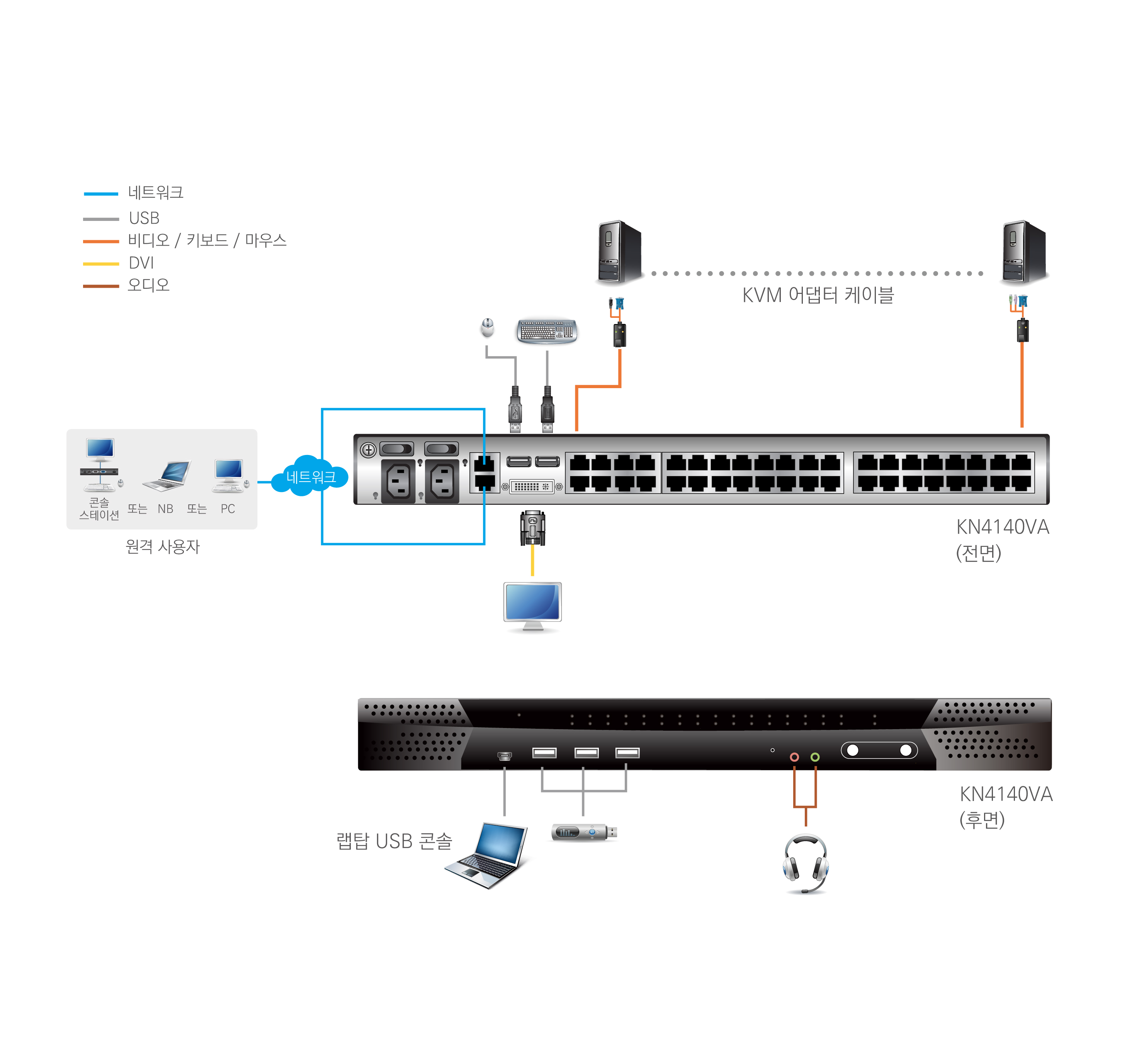 - 싱글 레벨일 때 최대 40대의 컴퓨터 모니터링 및 제어 가능, 또는 캐스케이드 확장으로 512대의 컴퓨터 제어 가능*