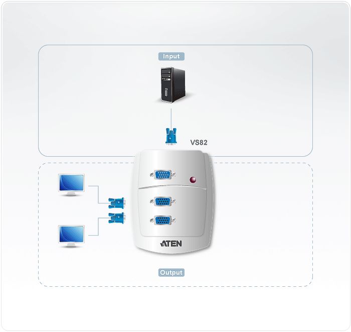The VS82 Video Splitter duplicates the video signal from an input source (i.e. a computer) and route it to up to 2 display devices (monitors, projectors, etc.). However, they go beyond being merely duplicators, in that they also enhance the video signals over distances up to 65 meters. Furthermore, they can be cascaded three levels to additional ATEN video splitters to support many numerous display devices. And they mount inconspicuously on the wall or out of sight.