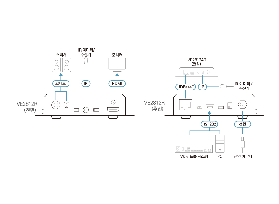 VE2812R은 VE2812T와 함께 사용하는 것을 권장합니다. VE2812R은 VE2812T의 IR/RS232 신호를 처리할 수 있어 입력 포트 전환을 통해 RS-232 명령어 모드로 VE2812T를 원격으로 제어할 수 있습니다. VE2812R은 고품질의 비디오가 필요한 회의실 또는 디지털 교육 환경과 같은 다양한 설정에 적합합니다.
