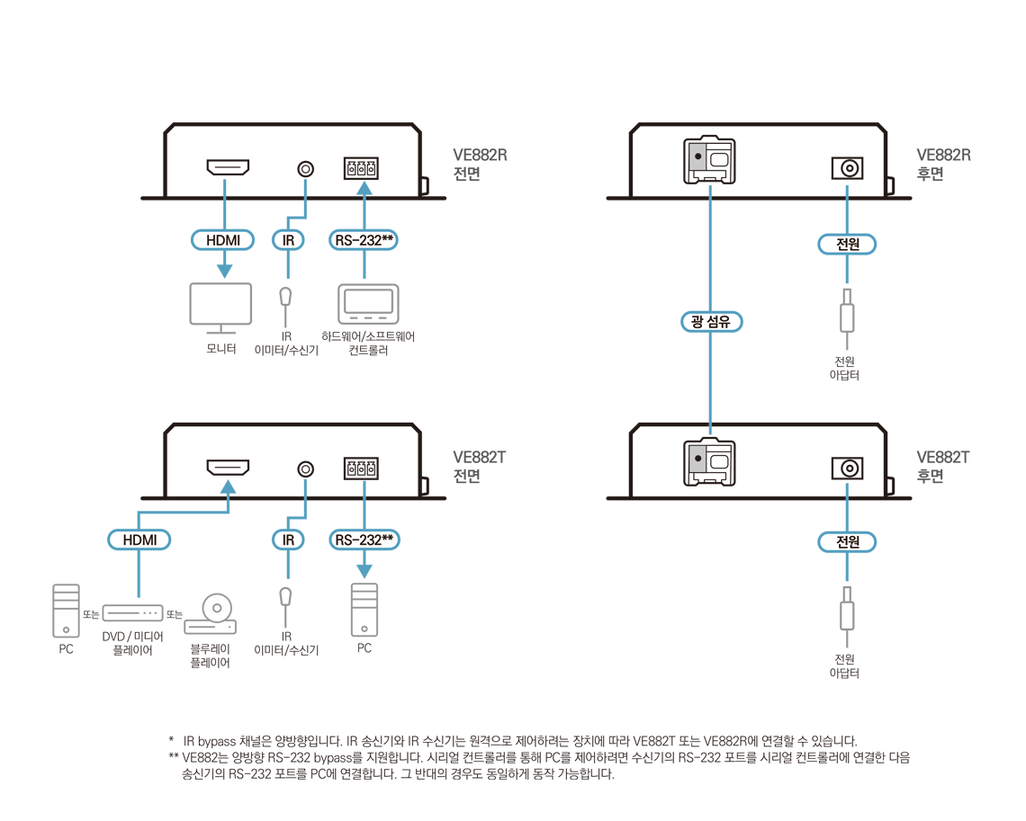 - HDMI와 IR, RS-232 신호를 하나의 광케이블을 이용하여 전송 범위 연장