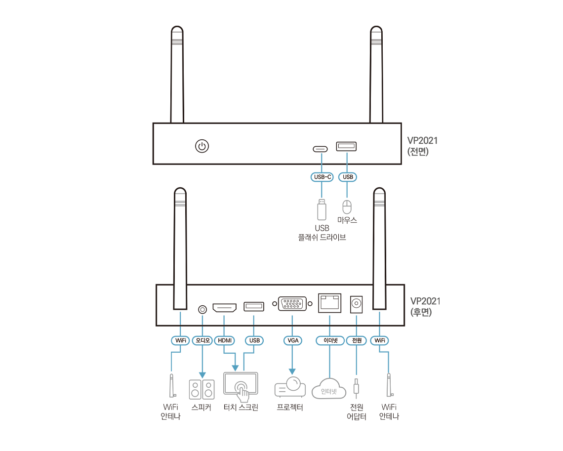 4K 무선 프리젠테이션 스위치 VP2021은 기존 참가자는 물론 방문자까지 노트북 또는 모바일 장치의 컨텐츠를 쉽게 공유할 수 있게 지원하는 무선 BYOD 솔루션입니다. VP2021을 사용하면 능동적인 협업 능력이 향상되어 효율적인 워크플로우가 가능합니다.