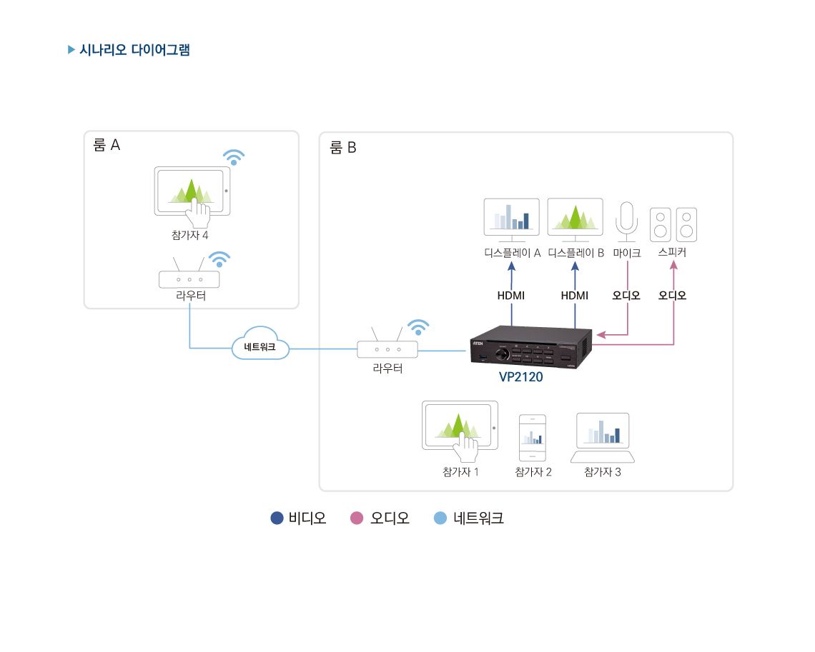 1개의 HDMI 입력, 2개의 HDMI 출력, 4개의 양방향 스트리밍 채널로 구성된 VP2120은 BYOD(Bring Your Own Device)를 가능하게 하여 허들룸에서의 즉석 회의, 빠른 협업 등 보다 효율적이고 생산적인 미팅을 지원합니다.
