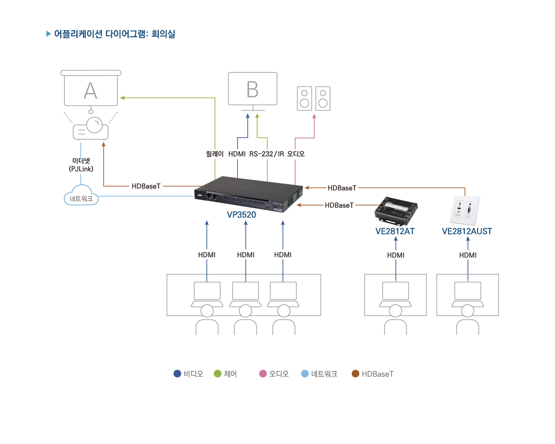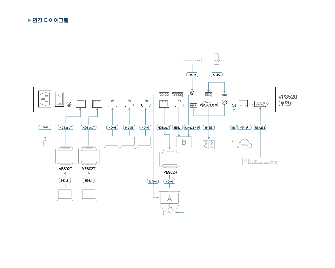 참고: 이는 VP3520의 HDBaseT 입력 및 HDBaseT 출력 포트를 모두 사용하면 가능한 것으로 각각 최대 70m까지 전송을 확장합니다.