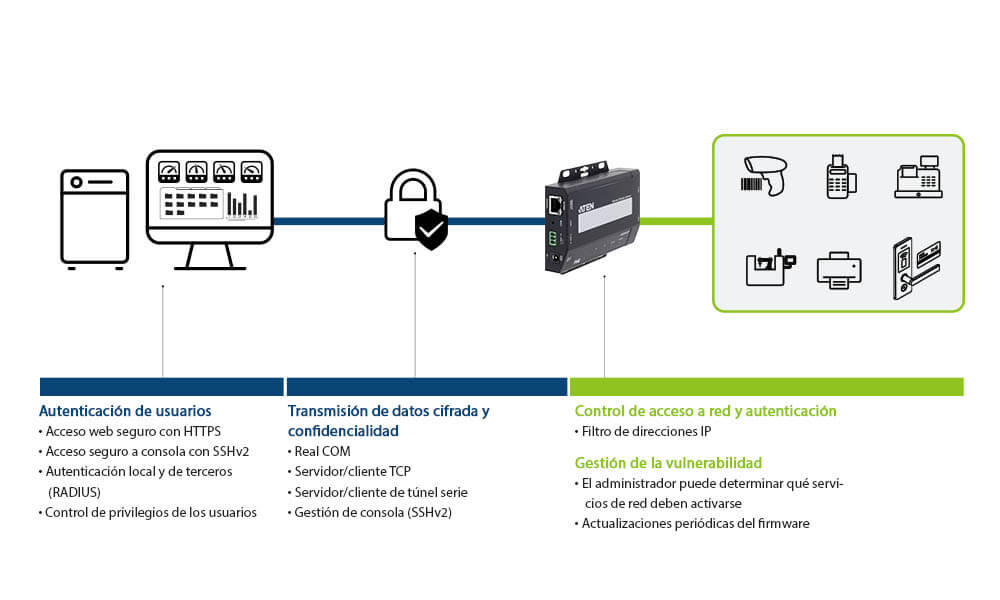 En la era de la IoT industrial, cada vez se producen más ciberataques que pueden hacer caer los sistemas y causar enormes pérdidas de tiempo y dinero. Para evitar posibles riesgos de vulnerabilidad, las empresas necesitan un sistema de defensa compuesto por varias capas que garantice la seguridad de las transmisiones de datos y que incluya actualizaciones periódicas del firmware, así como diversas formas de autenticación y control de acceso cifradas. La solución con conectividad serie a Ethernet SN3402P de ATEN está equipadas con funciones de seguridad a todos los niveles, incluidas el control de acceso a la red y la autenticación de usuarios, la integridad y la confidencialidad de los datos. Además, cuenta con un modo de funcionamiento disponible para funciones de seguridad avanzadas, que permite adquirir los datos de campo necesarios y proporcionar protección de primera línea.
