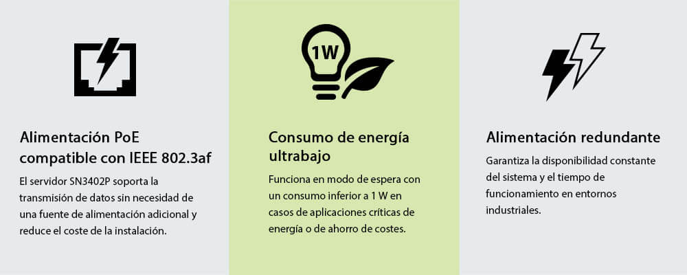 El servidor SN3402P proporciona acceso a una consola web con la que es posible realizar una instalación rápida en tres pasos. Gracias a su acceso a través de un navegador con funciones intuitivas en varios idiomas, es posible configurar y controlar rápidamente los dispositivos en tan solo tres pasos para activar la aplicación. Esto hace que la configuración sea sencilla y rápida, de modo que el proceso se puede completar en aproximadamente un minuto. Además, para aplicaciones sensibles al ancho de banda, también está disponible una consola Telnet/SSH como solución para situaciones en las que el ancho de banda es reducido.