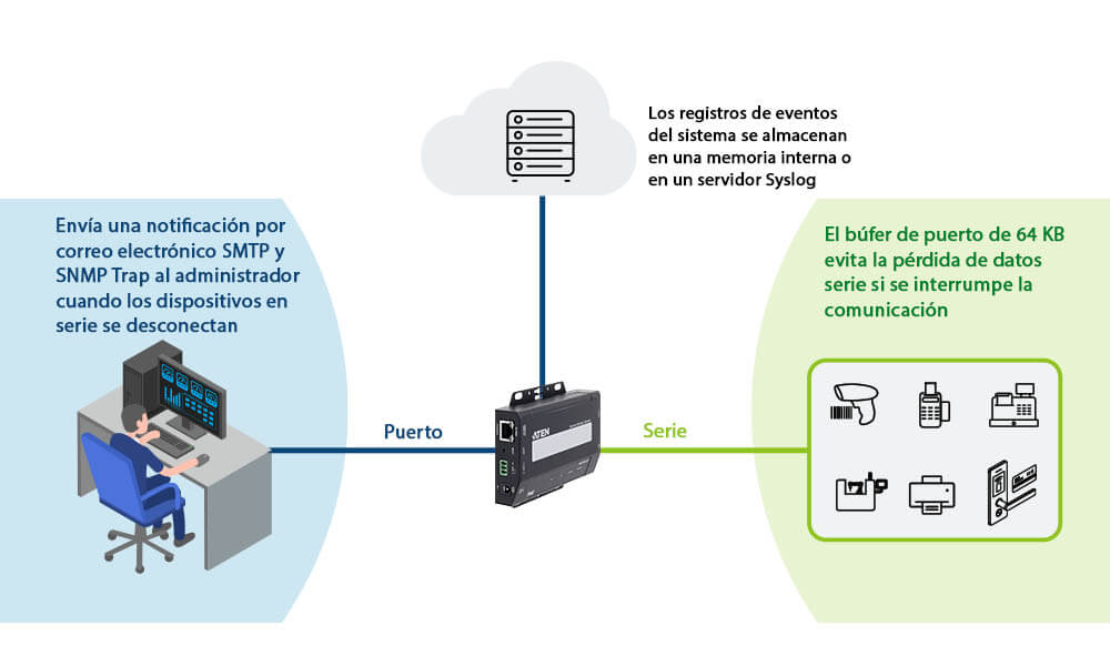 ATEN es consciente de la importancia que tienen las pérdidas de datos y las brechas de seguridad. El servidor de dispositivos seguros SN3402P cuenta con un búfer de puerto de 64 KB para evitar la pérdida de datos en caso de que se caiga la red. Por otro lado, las notificaciones de eventos se enviarán automáticamente por correo electrónico SMTP y SNMP Trap si los dispositivos serie se desconectan debido a un fallo de alimentación, o si se produce un error definido por el usuario. Además, los registros de eventos del sistema están disponibles para registrar y hacer un seguimiento del historial de operaciones. Estos registros pueden guardarse en la memoria interna o en el servidor Syslog y permiten recuperar los datos con fines de monitorización y resolución de problemas en cualquier momento.