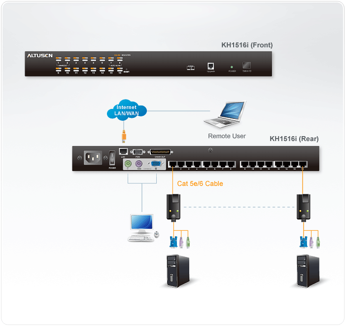 - Switch KVM de 16 Puertas con Acceso Remoto: monitorea y controla hasta 16 servidores desde una consola KVM.