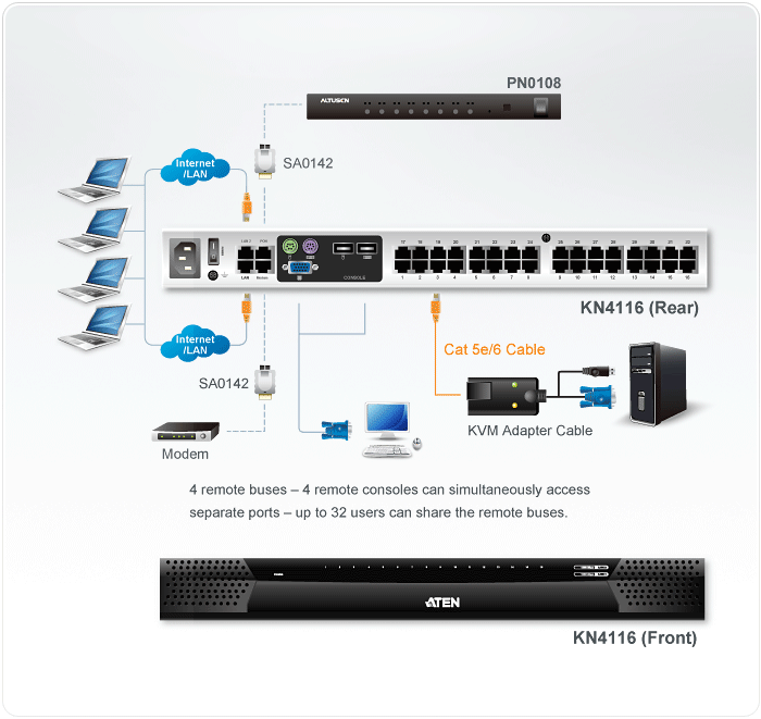 La nueva generación de switches KVM sobre IP de Aten, la serie KN, permite acceso a consola local y acceso remoto sobre IP para que los operadores supervisen el centro de datos y accedan a él a través de la red desde el navegador web. Además ofrecen acceso fuera de banda con compatibilidad con módem externo para la resolución de problemas a nivel de la BIOS cuando la red se encuentra inactiva.