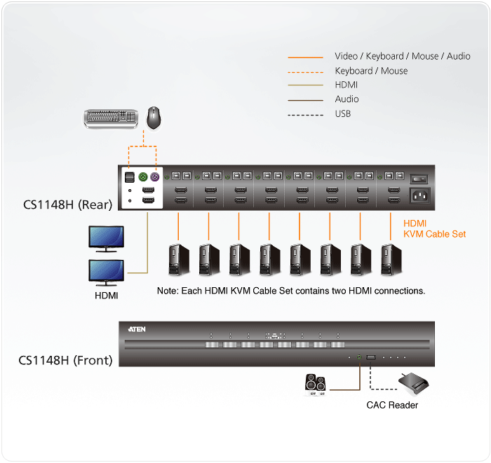 - 1x switch KVM seguro USB HDMI de dos pantallas de 8 puertos CS1148H