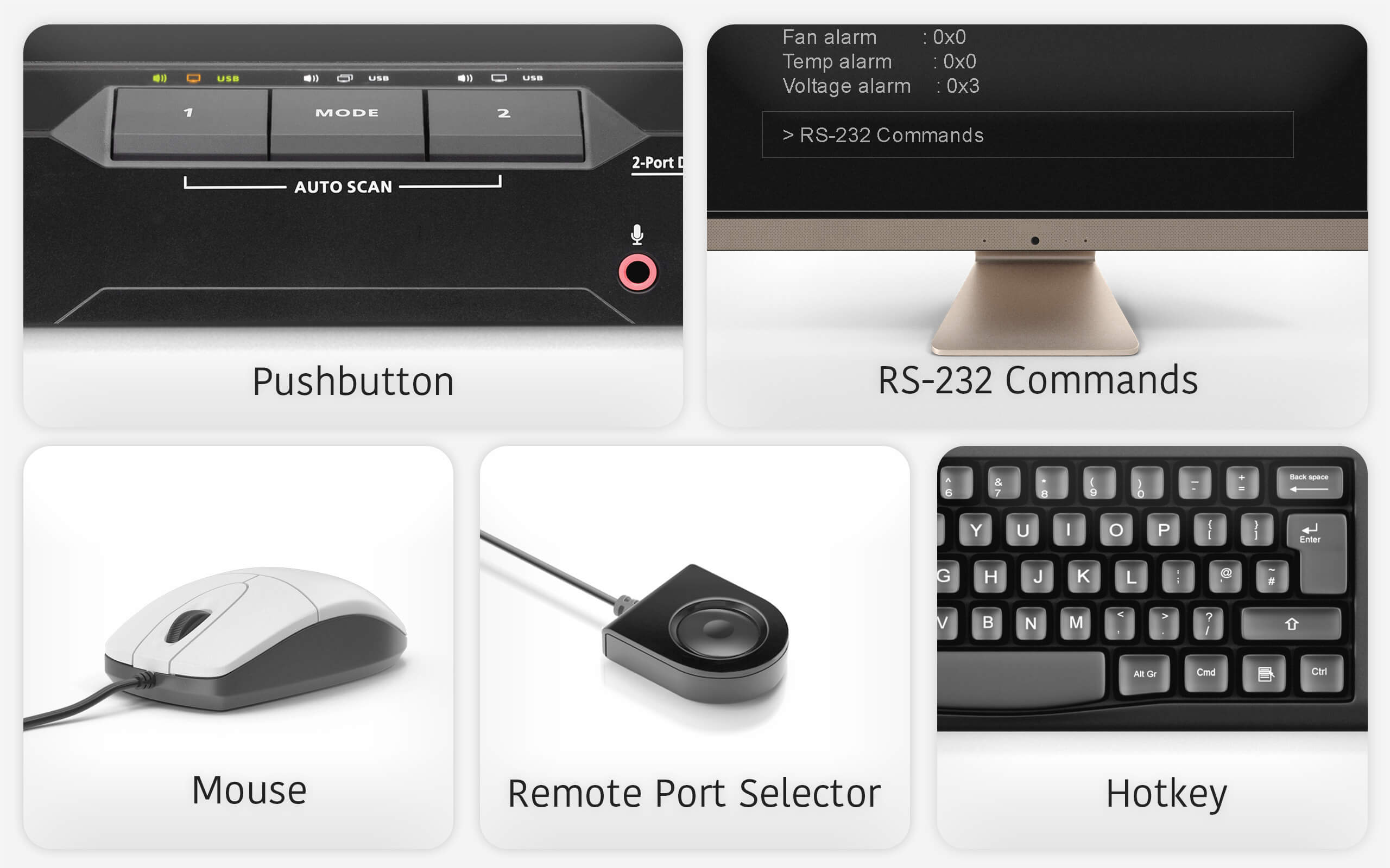 - Selección de ordenador mediante botones pulsadores, selector de puerto remoto, teclas de acceso rápido, ratón y comandos RS-232