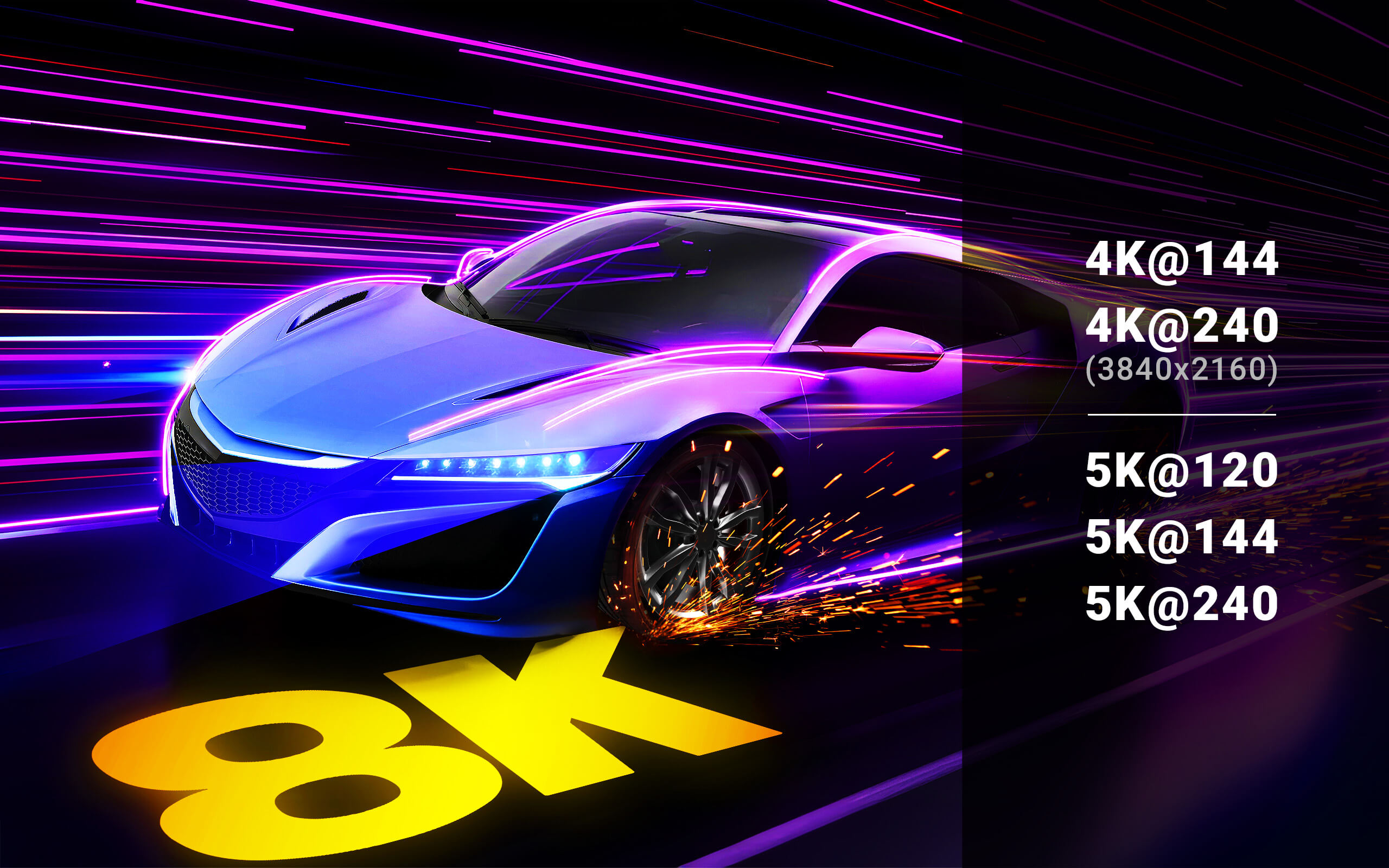 - Hasta 7680 × 4320 a 60 Hz, 5120 × 2880 a 60 Hz y 4096 × 2160 a 120 Hz
