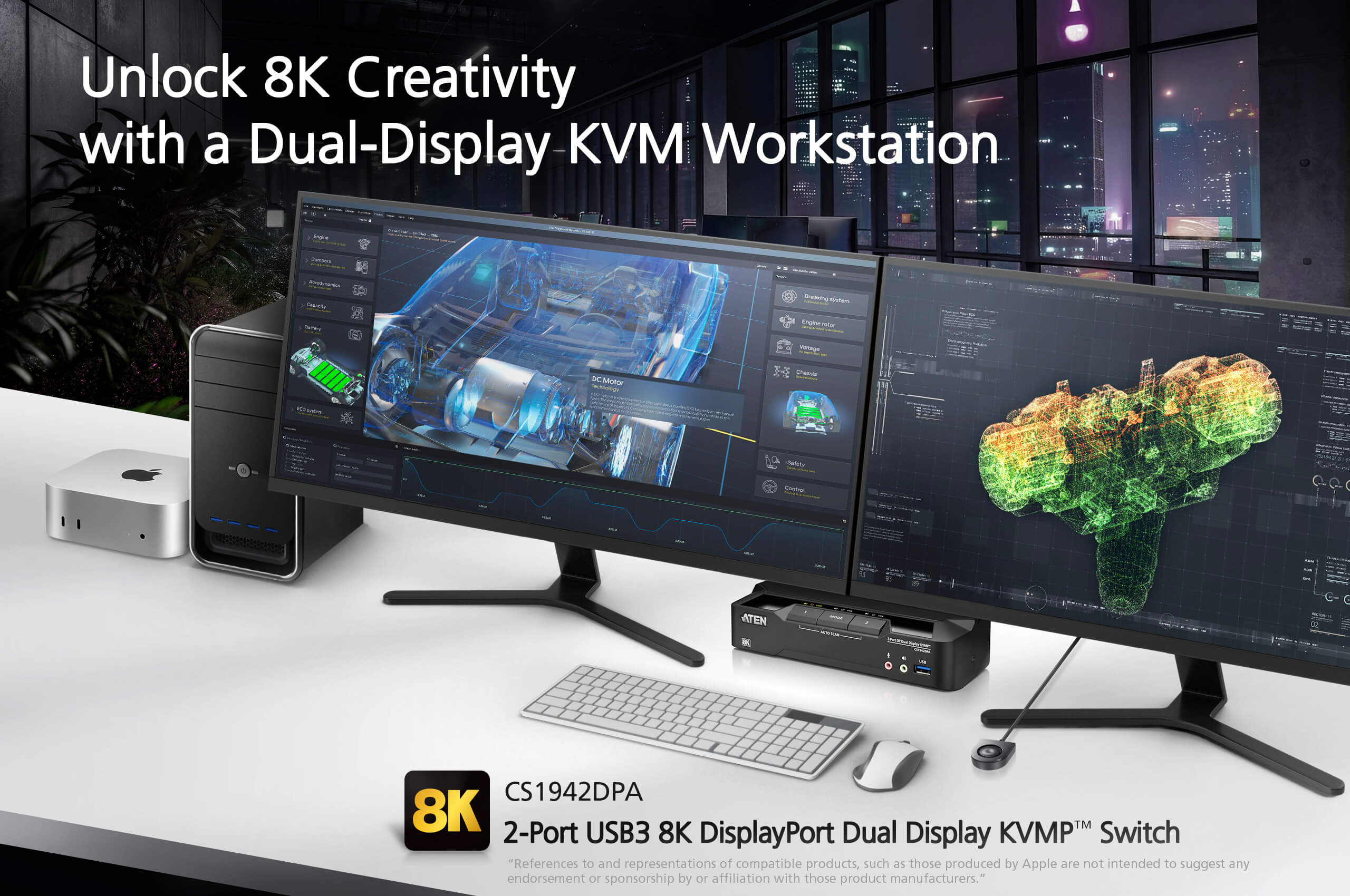 Impulse flujos de trabajo multipantalla avanzados con un conmutador KVM de doble monitor 8K para aplicaciones creativas, financieras y profesionales.