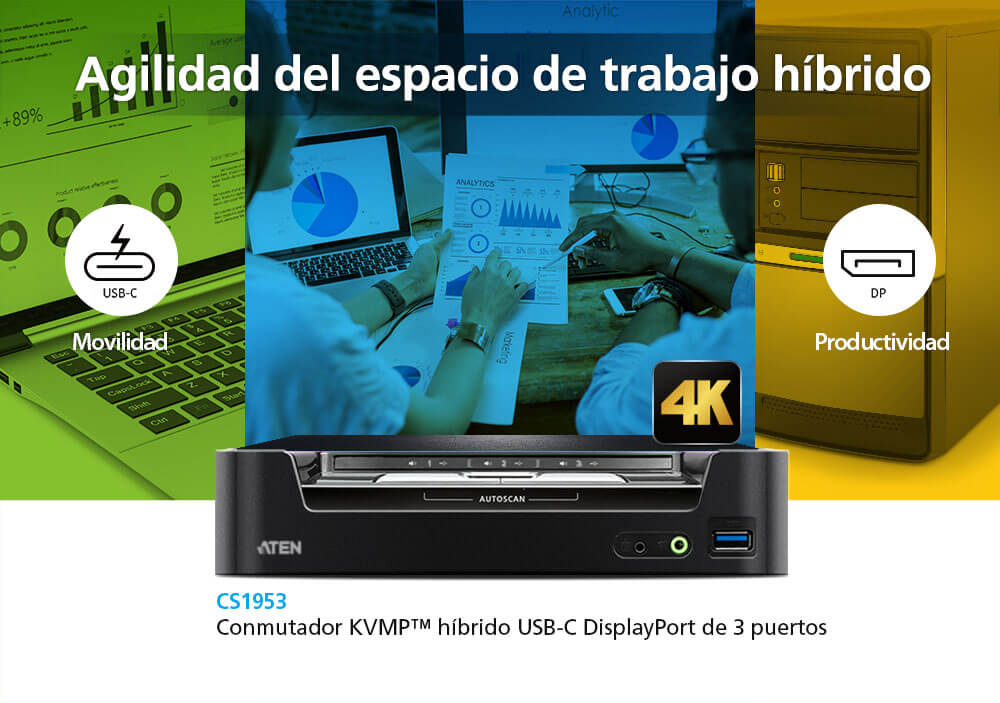 El CS1953 de ATEN es un switch KVMP™ híbrido que integra un dispositivo USB-C y un PC DisplayPort en una estación de trabajo de sobremesa. El CS1953 da un paso de gigante con respecto a los modelos KVM de interfaz digital, ya que incluye funcionalidad USB Tipo-C que transfiere vídeo, audio y datos, e incluso proporciona USB Power Delivery 3.0 para la carga de dispositivos USB-C. Esto significa que, con un único cable USB-C, los usuarios pueden evitar configuraciones complejas de cables y disfrutar de un mejor entorno de trabajo.