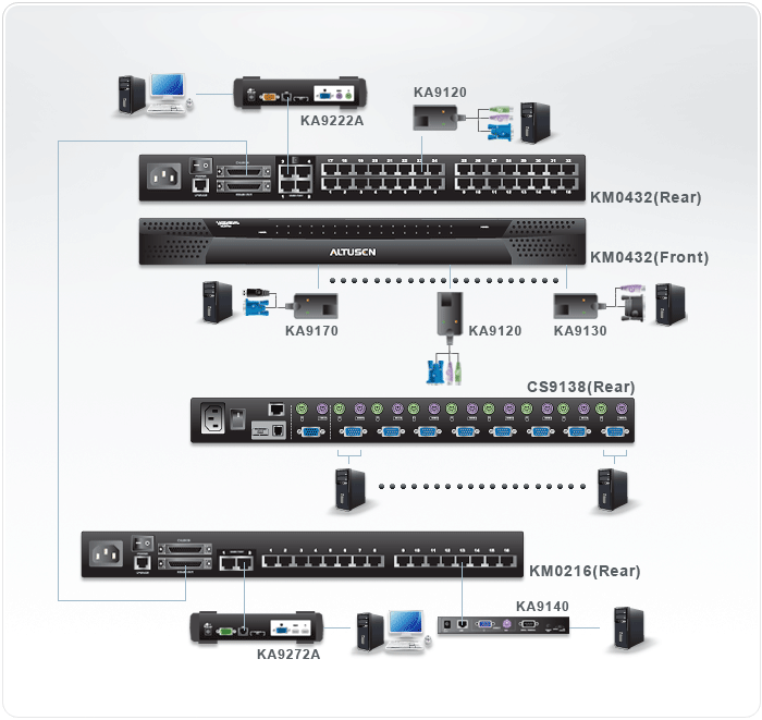 Los switches KVM Matrix™ de Altusen son increiblemente flexibles. Además de soportar múltiples plataformas de servidores, las consolas pueden estar separadas de los servidores a una distancia de hasta 300 metros. Los administradores TI no necesitan moverse de sus escritorios para administrar localmente cientos de servidores, pues los switches KVM Matrix™ les permiten mantenerse en sus puestos de trabajo y tener acceso a los servidores ubicados en el datacenter. Esto elimina el inconveniente del tiempo y el esfuerzo que significa moverse físicamente hacia el datacenter cada vez que se necesita acceder a los servidores.