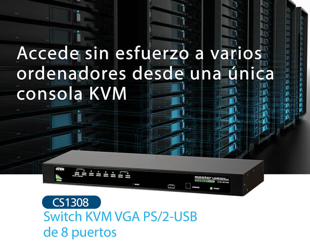 El Switch KVM CS1308 permite acceder y controlar hasta 64 computadores desde una sola consola (teclado, pantalla y mouse). Se pueden conectar en cascada hasta 8 switches adicionales, lo que permite controlar un total de 64 ordenadores desde una única consola KVM. El Switch soporta tanto conexiones USB como PS/2.