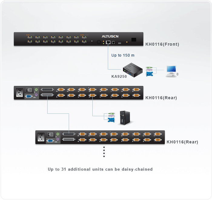 Los KVM de Alta Densidad ALTUSEN están disponibles en varios modelos. Estos incluyen el KH0116, que cuando se combina con el KVM Extender KA9250, puede ser controlado desde una consola remota hasta 150 metros de distancia vía cable Cat5 o superior.