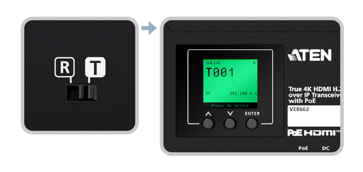 - Un único interruptor DIP permite cambiar fácilmente entre transmisor y receptor, con las letras «T» o «R» mostradas en la pantalla LCM y una retroiluminación distinta para facilitar la identificación