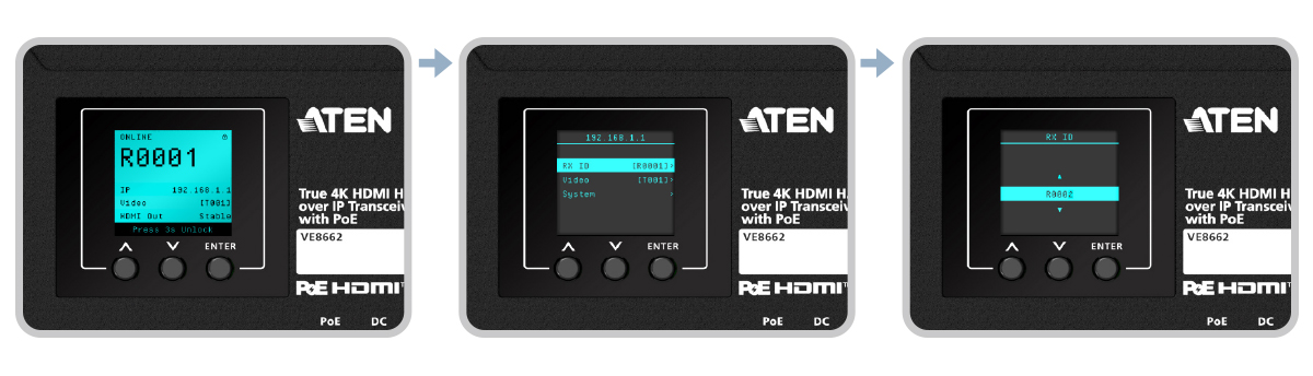 El VE8662 garantiza una configuración sin esfuerzo y se puede configurar fácilmente como transmisor para fuentes de vídeo o receptor para monitores. Basta con asignar un número de identificación en lugar de realizar complejos ajustes de IP para disfrutar de una instalación rápida y sin complicaciones.