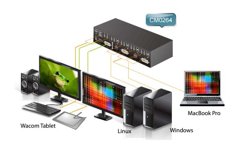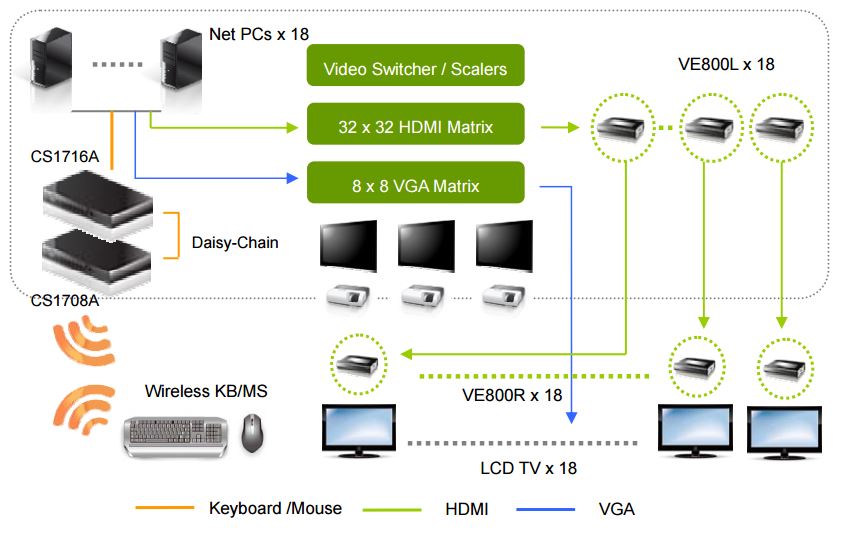 Una compañía de apuestas celebra reuniones de ventas con regularidad en las que el presidente presenta información sobre el mercado de las apuestas en diferentes regiones. La compañía desea una solución que permita al presidente controlar y cambiar entre diferentes fuentes a varias pantallas utilizando una consola inalámbrica (monitor, teclado y ratón) que sea compatible con su instalación actual...
