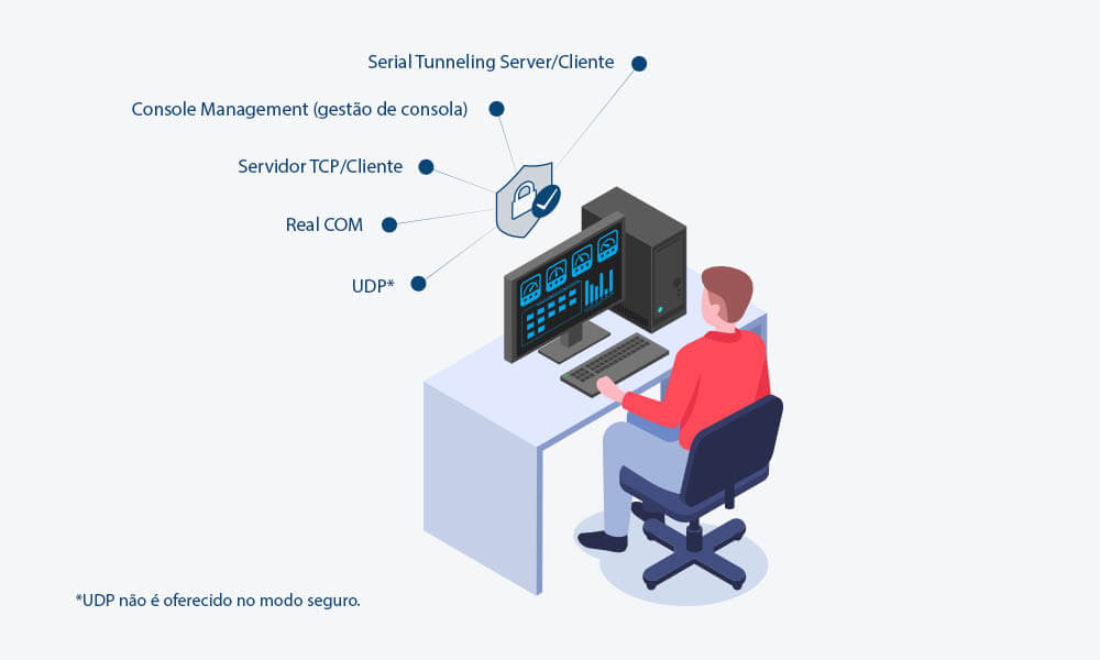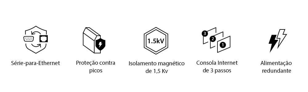 - Modos de operação protegida - Secure Real COM, Secure TCP Server / Client, Secure Serial Tunneling Server / Client, Console Management (SSH) e Console Management Direct (SSH)