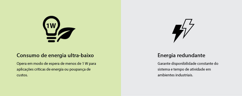 - Entrada de alimentação redundante (conector de alimentação e bloco de terminais) para alimentação à prova de falhas