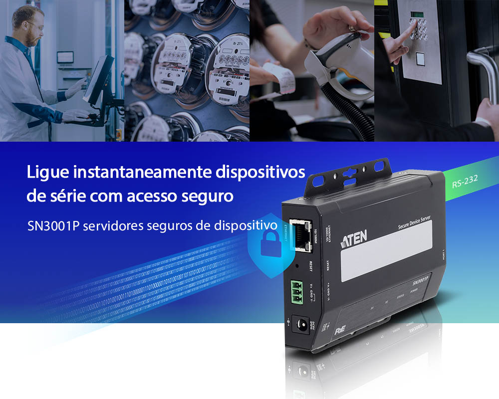 Os servidores seguros de dispositivo da série ATEN SN3000 são dispositivos de rede externos com base em IP que ligam com segurança dispositivos legados de série RS-232 a uma rede Ethernet para serem acedidos remotamente de um computador localizado em qualquer lugar, permitindo que expanda o número de portas de série para qualquer computador anfitrião numa rede.