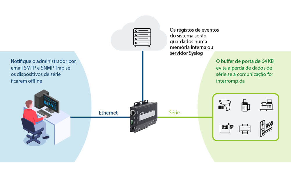 A ATEN entende a gravidade da perda e violação de dados. O SN3001P possui buffer de porta de 64 KB para evitar perda de dados caso uma rede esteja inativa e notificações de eventos serão enviadas automaticamente por email SMTP e SNMP Trap se os dispositivos de série ficarem offline devido a falha de energia ou acionarem um erro definido pelo utilizador. Para além disso, os logs de eventos do sistema estão disponíveis para registar e rastrear o histórico de operações e podem ser guardados na memória interna ou no servidor Syslog, para que possa recuperar dados para monitorização e resolução de problemas a qualquer momento