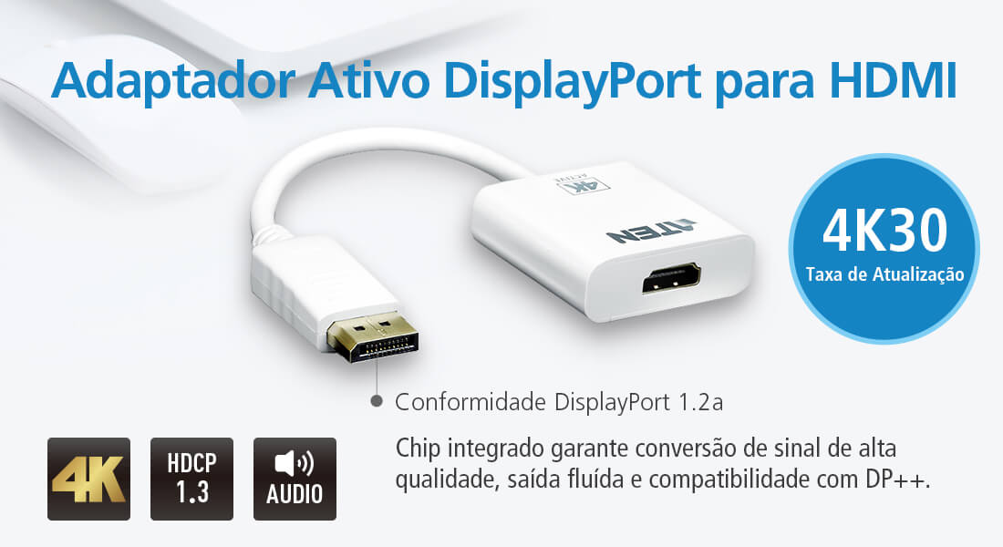 - Adaptador ativo – integra um chip avançado que garante a conversão estável de sinal vídeo mesmo quando a fonte vídeo não suporta dual-mode DisplayPort (DP++)*