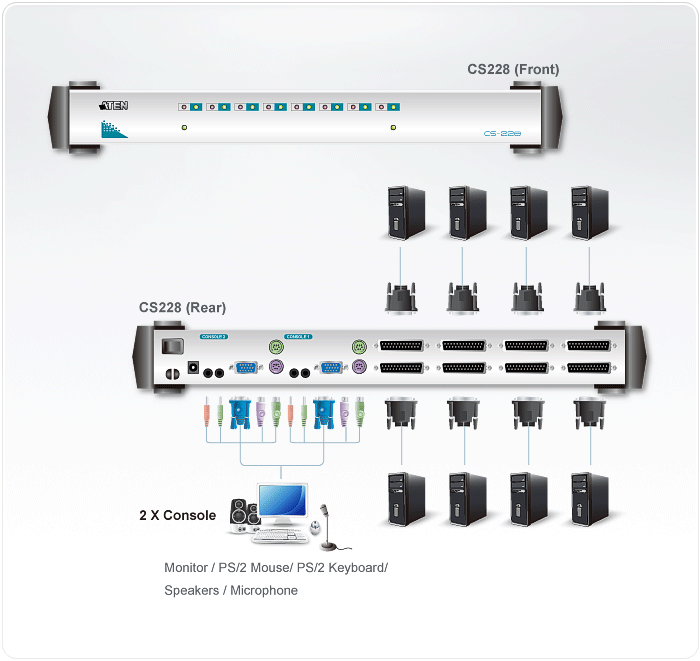 - O CS228 é um Switch KVM de alta eficiência que oferece a mais eficiente solução. O console traz 2 PS/2 embutidos que permitem que usuários controlem 8 servidores individualmente ou por compartilhamento. O DB-25 embutido do CS228 pode reduzir transtornos com cabos em salas de componentes e pode melhorar a qualidade de sinal e eficiência da operação.