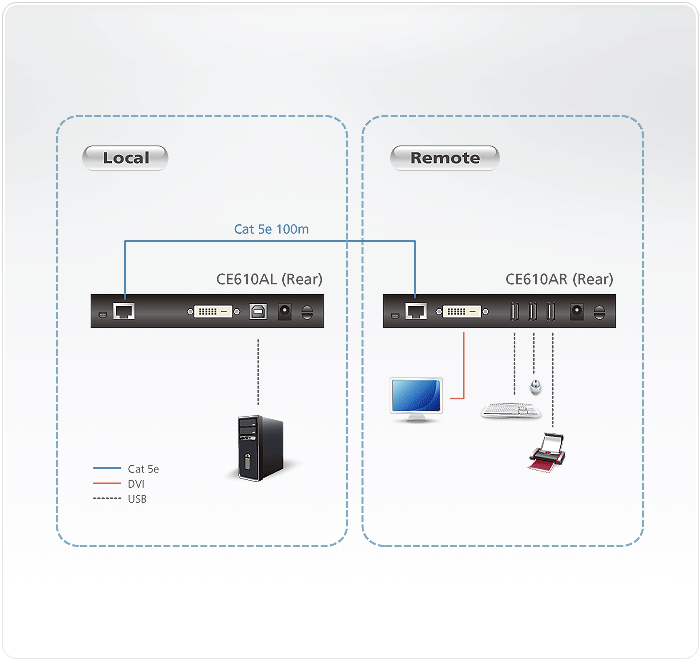 O Extensão KVM CE610A USB DVI é um Extensão DVI e USB compatível com a tecnologia ExtremeUSB® e HDBaseT. O CE610A pode prolongar sinais DVI e USB 2.0 até 300 pés (100 m) da fonte, usando um só cabo Cat 5e/6.