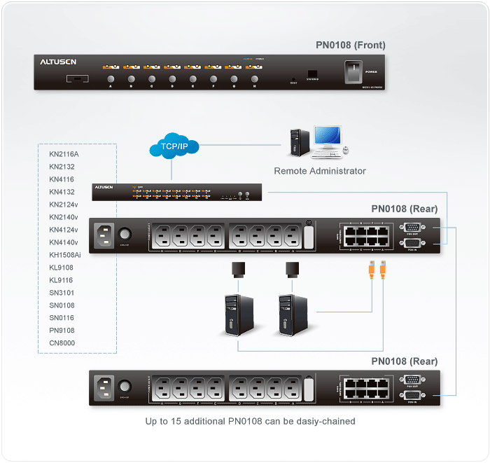 O PN0108 da Altusen é equipado com 8 portas hotpluggable para um fácil gerenciamento da sala de servidores. Cada porta pode ser controlada individualmente, com isso seus usuários podem determinar a sequência e tempo de atraso de cada porta para permitir que o equipamento seja ligado na ordem correta. O agendamento para ligar/desligar permite iniciar/desligar/paralisar/reiniciar com base diária, semanal ou mensal. O PN0108 é o mais fácil, confiável e com melhor custo benefício para obter acesso ao seu servidor remotamente.*
