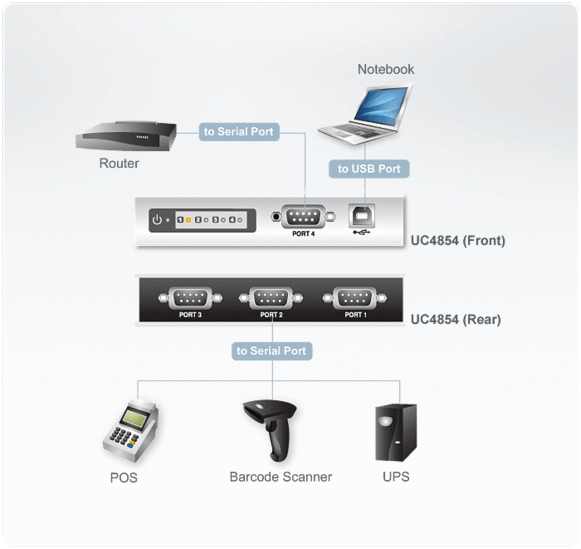 A ATEN oferece 4 modelos nestas séries: Hub 2/4 portas USB para Serial RS-422/485; Hub 2/4 portas USB para Serial RS-232