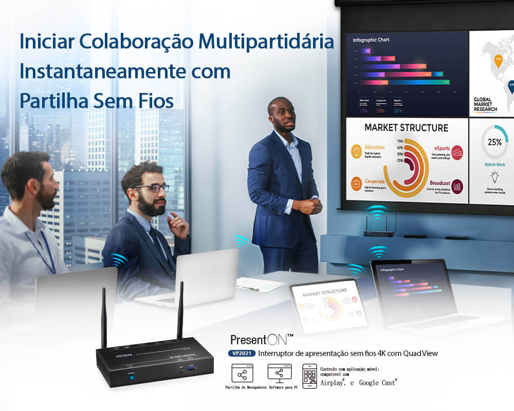 Como solução sem fios BYOD, o VP2021 é um switch de apresentação 4K com um módulo Wi-Fi e múltiplas abordagens de acesso para a conectividade essencial que uma reunião bem sucedida requer. Permite aos utilizadores lançar até 4K conteúdos para 1 ecrã com HDMI e 1 ecrã com VGA ao mesmo tempo através de Wi-Fi a partir dos seus computadores portáteis ou dispositivos móveis. Tal conectividade sem fios suporta todas as principais plataformas operacionais, incluindo Windows, MacOS e Android, através da aplicação ATEN Wireless Presentation Switch App dedicada. Além disso, o VP2021 é compatível com o AirPlay1, Google Cast1, and Chrome.